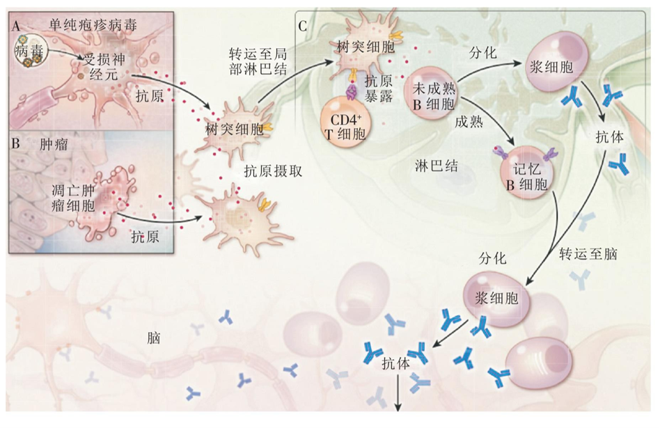 根據病因的(de)不同,腦(nǎo)炎可(kě)分(fēn)爲感染性腦(nǎo)炎和(hé)自身免疫性腦(nǎo)炎 (AE)。感染性腦(nǎo)炎是由于感染了細菌、真菌、病毒、寄生蟲等病原微生物(wù)而引起的(de)腦(nǎo)炎,AE 則是因爲神經中樞自身抗原被免疫系統識别爲外來抗原,而激發免疫殺傷功能(néng)發生的(de)一系列炎性反應(如(rú)下圖)。