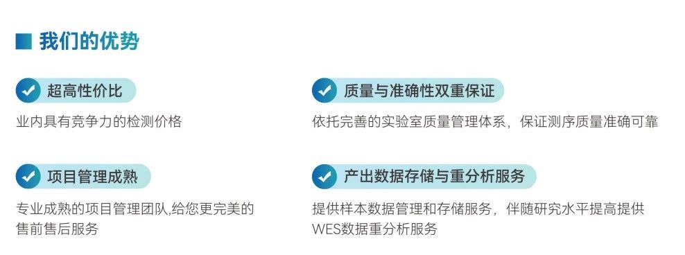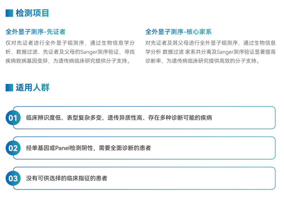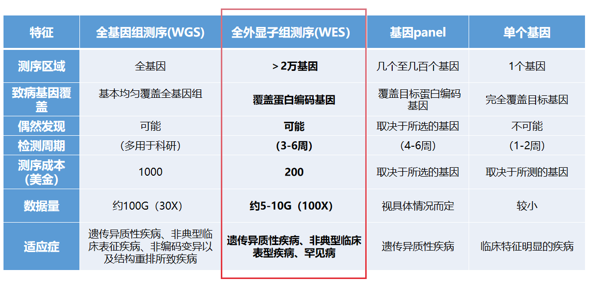 WES 是比全基因組測序更爲經濟高(gāo)效,比基因 panel 分(fēn)析的(de)基因更全面、發現緻病性基因變異機率更高(gāo)的(de)測序方法,憑借其有(yǒu)全面性、有(yǒu)效性、極高(gāo)性價比等優勢,被廣泛應用(yòng)于遺傳異質性疾病、非典型臨床表型疾病、罕見病等。