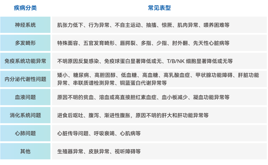 可(kě)推薦進行(xíng) WES 遺傳病檢測的(de)常見臨床表型:
